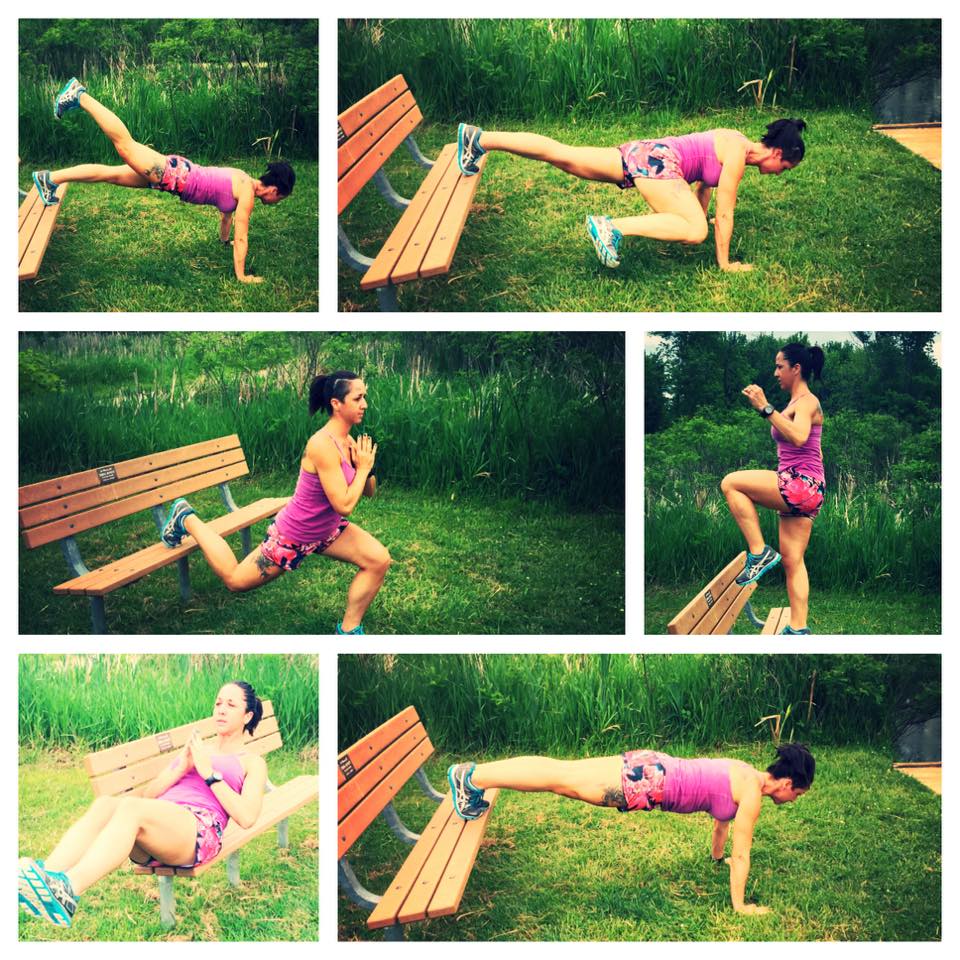 1. Step ups– can be done slowly or quickly to up the cardio ante. Easy: step up with one foot. Moderate: bring the knee up. Advanced: throw in a kick.